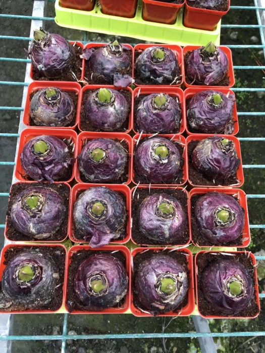 6月份把鳞茎挖回后,将大球和子球分开,“大球秋植后来年早春可开花,子球需培养3年才能开花。由于风信子自然分球率低,一般母株栽植一年以后只能分生1-2个子球,为提高繁殖系数,可在夏季休眠期对大球采用阉割手术,刺激它长出子球。