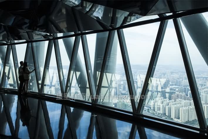 107/108观光层是广州塔室内观光的最高点,分别是以白云和星空为主题的两层观光大厅,城市新中轴线和广阔珠江尽收眼底。每层都设有一处全透明钢化玻璃构造的“悬空走廊”,凌空观景,是拍摄留念的绝佳地点。